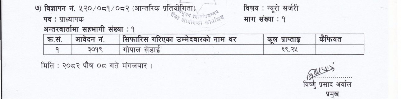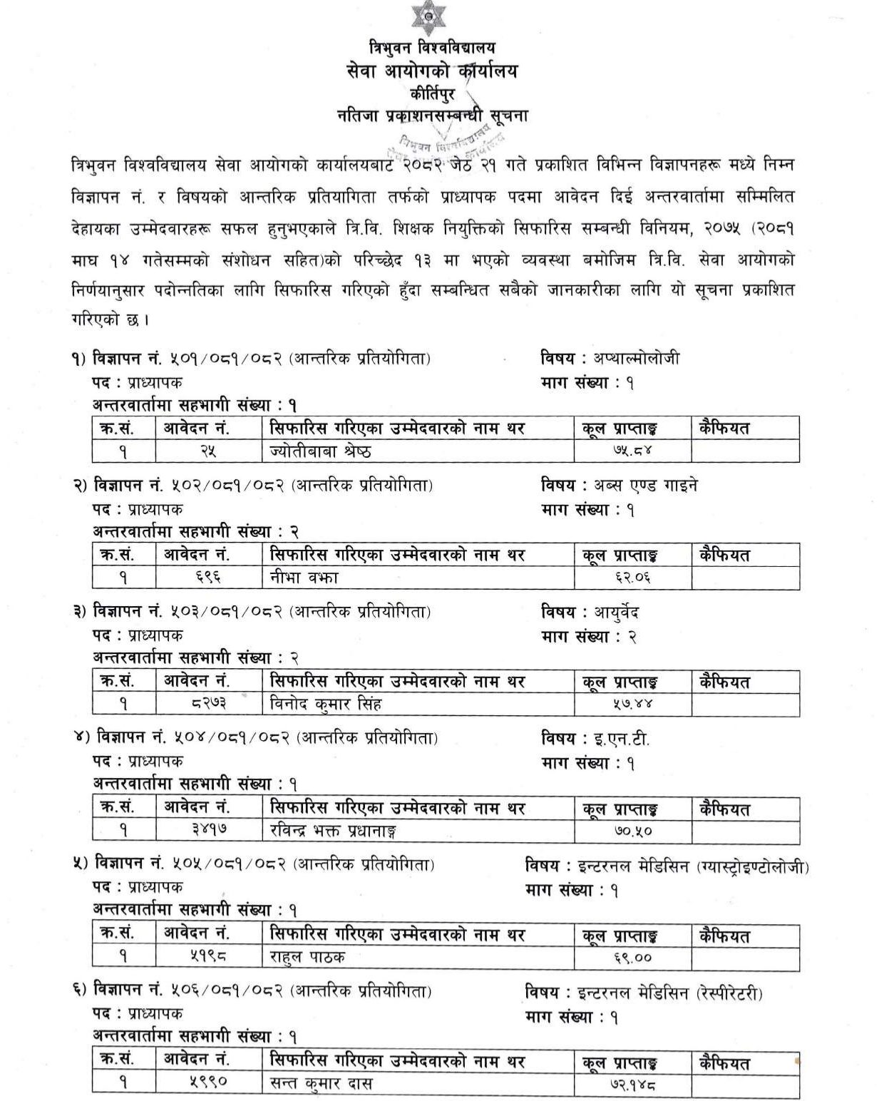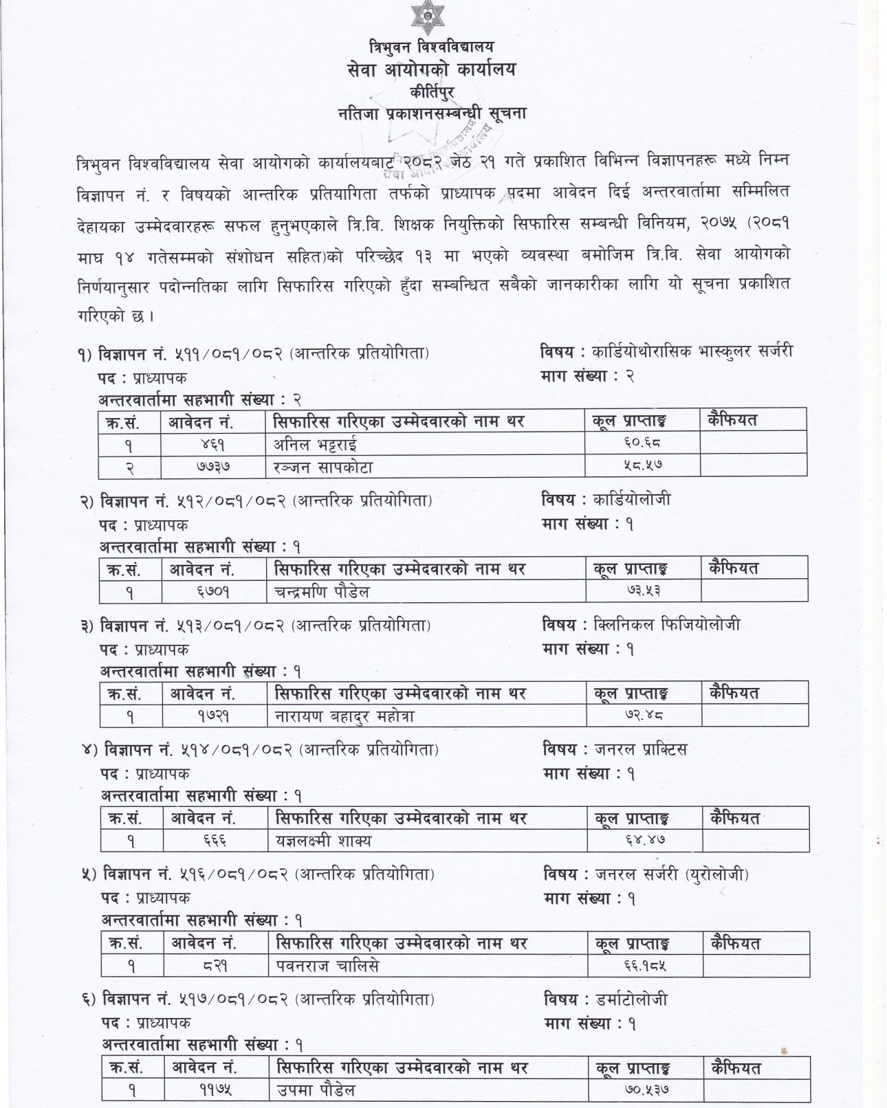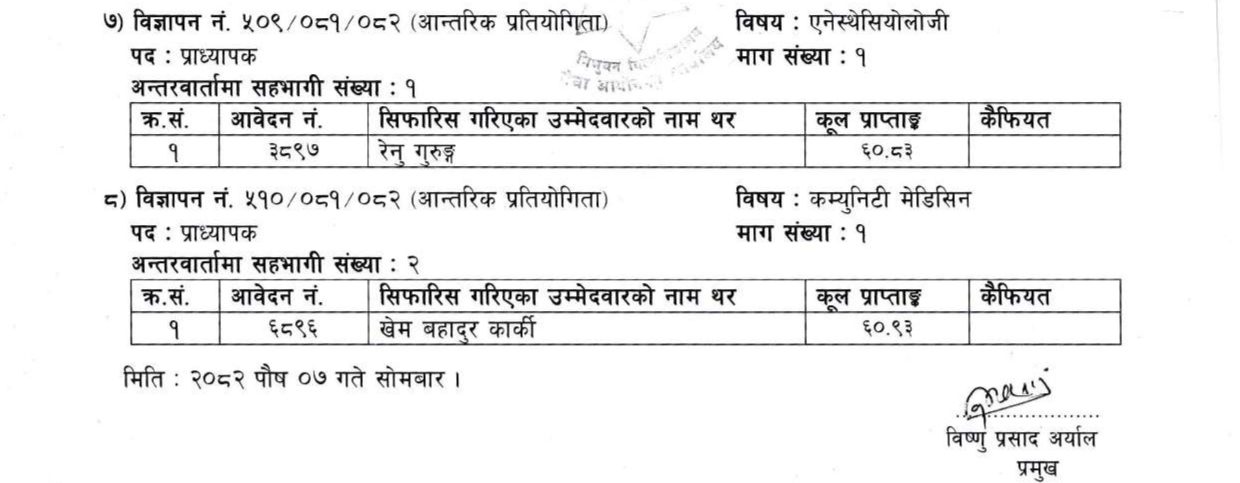 यस्तै सेवा आयोगले कार्डियोथोरासिक भास्कुलर सर्जरीबाट डा. अनिल भट्टराई र डा. रञ्जन सापकोटा, कार्डियोलोजीबाट डा. चन्द्रमणि पौडेल, क्लिनिकल फिजियोलोजीबाट डा नारायणबहादुर महोत्रा र जनरल प्राक्टिसबाट यज्ञलक्ष्मी शाक्य रहेका छन् ।