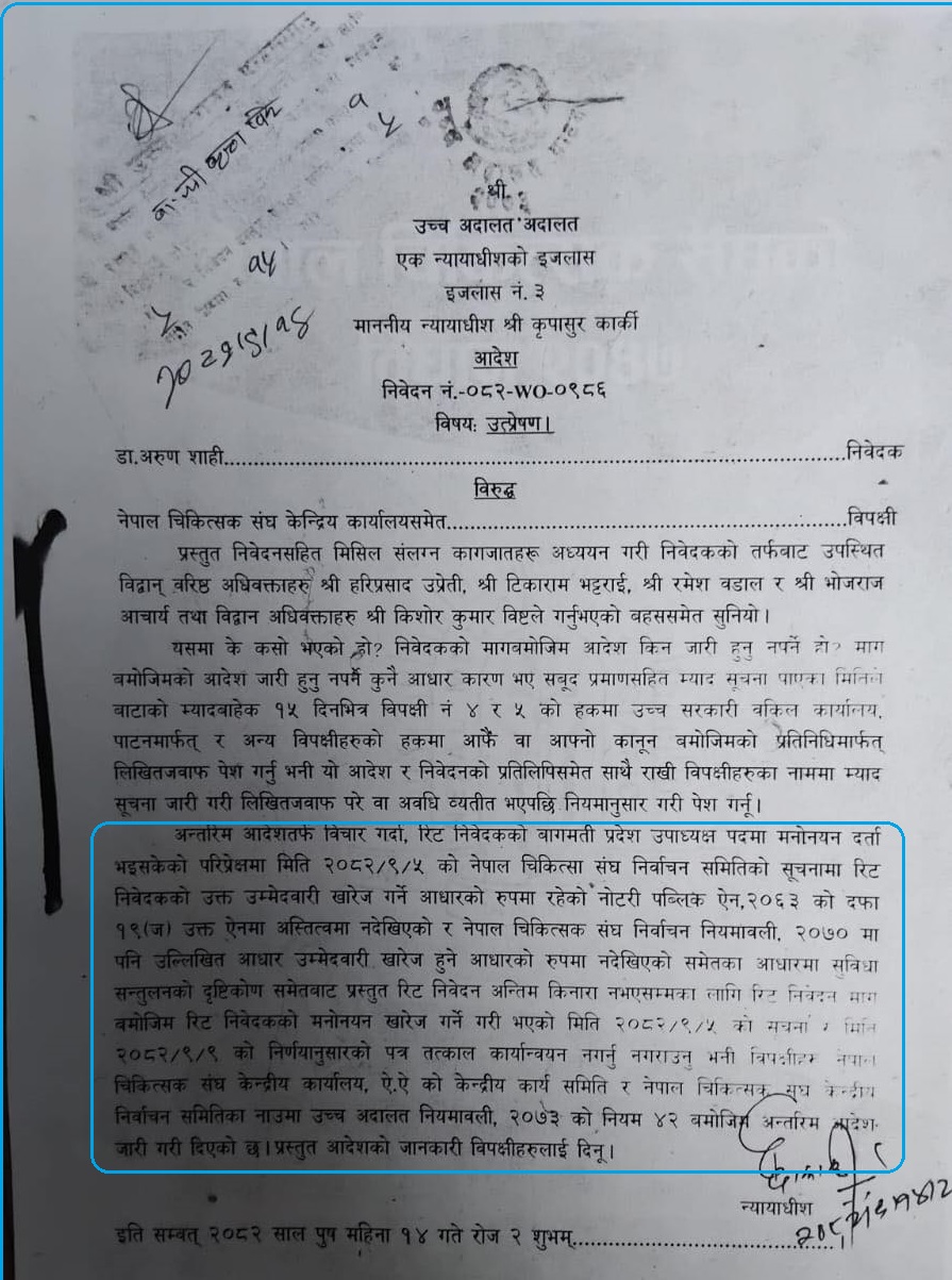 न्यायाधीश कृपासुर कार्कीको एकज इजलासले अन्तरिम आदेश जारी गरेको हो । साथै उच्च अदालतले नेपाल चिकित्सक संघ, संघको निर्वाचन समिति लगायत ६ व्यक्ति तथा संस्थाका नाममा कारण देखाउ आदेश जारी गरेको छ।