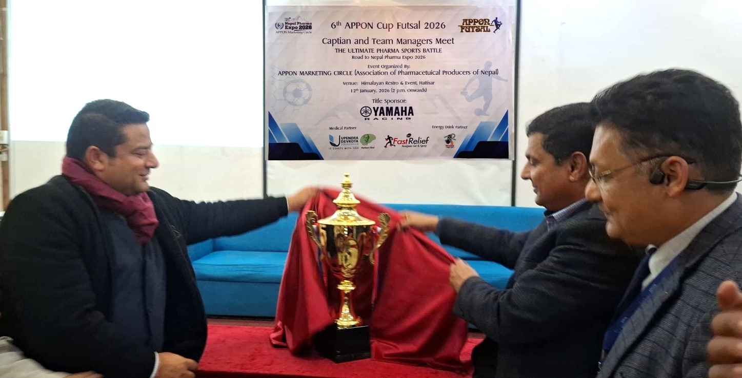 काठमाडौँ, २९ पुस । नेपाल औषधी उत्पादक संघ (एपोन) को आयोजनामा आगामी २ माघ देखि छैठौँ एपोन कप फुटसल २०२६ प्रतियोगिता हुने भएको छ । १० औँ फर्मा एक्स्पोको अवसरमा एपोन मार्केटिङ सर्कलले फुटसल प्रतियोगिता आयोजना गर्न लागेको हो ।