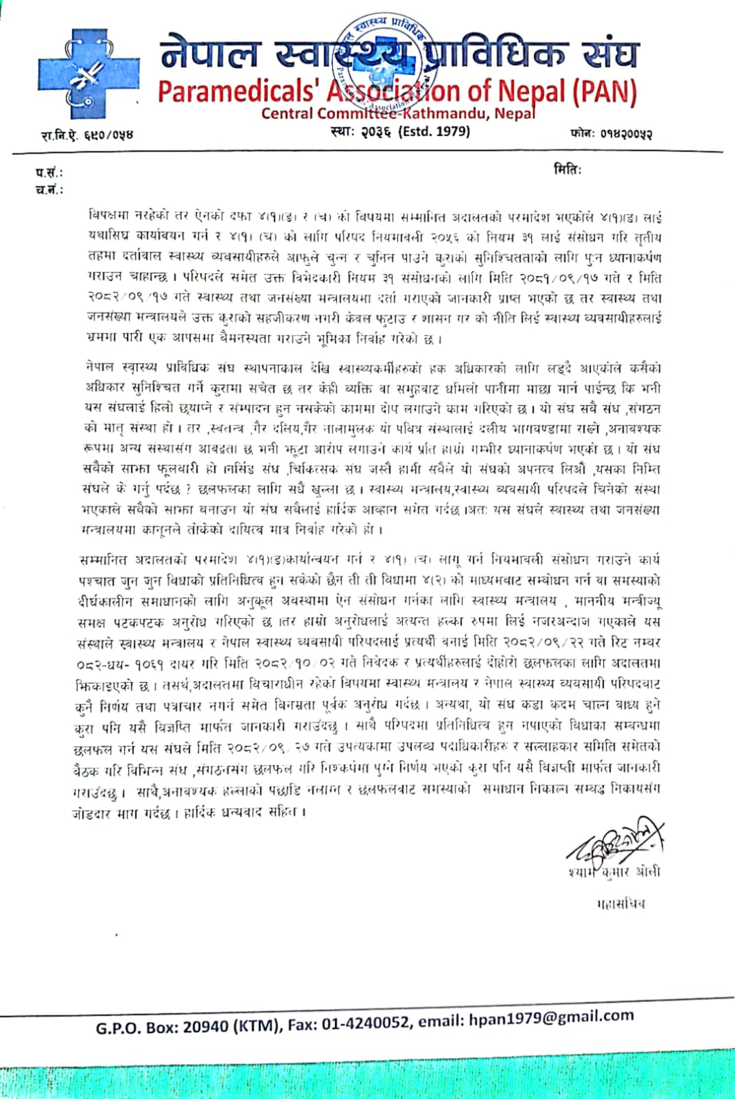 रिक्त पदाधिकारी नियुक्तीका विषयमा स्वास्थ्य मन्त्रालय तथा परिषद्का कतिपय पदाधिकारीले गैर कानूनी निर्णय लिन लागेको भन्ने विषय जानकारीमा आएको भन्दै पानले त्यसो नगर्न सचेत गराएको हो ।