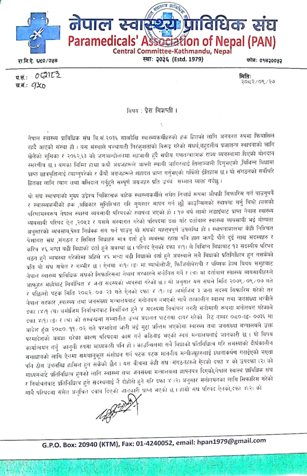 रिक्त पदाधिकारी नियुक्तीका विषयमा स्वास्थ्य मन्त्रालय तथा परिषद्का कतिपय पदाधिकारीले गैर कानूनी निर्णय लिन लागेको भन्ने विषय जानकारीमा आएको भन्दै पानले त्यसो नगर्न सचेत गराएको हो ।