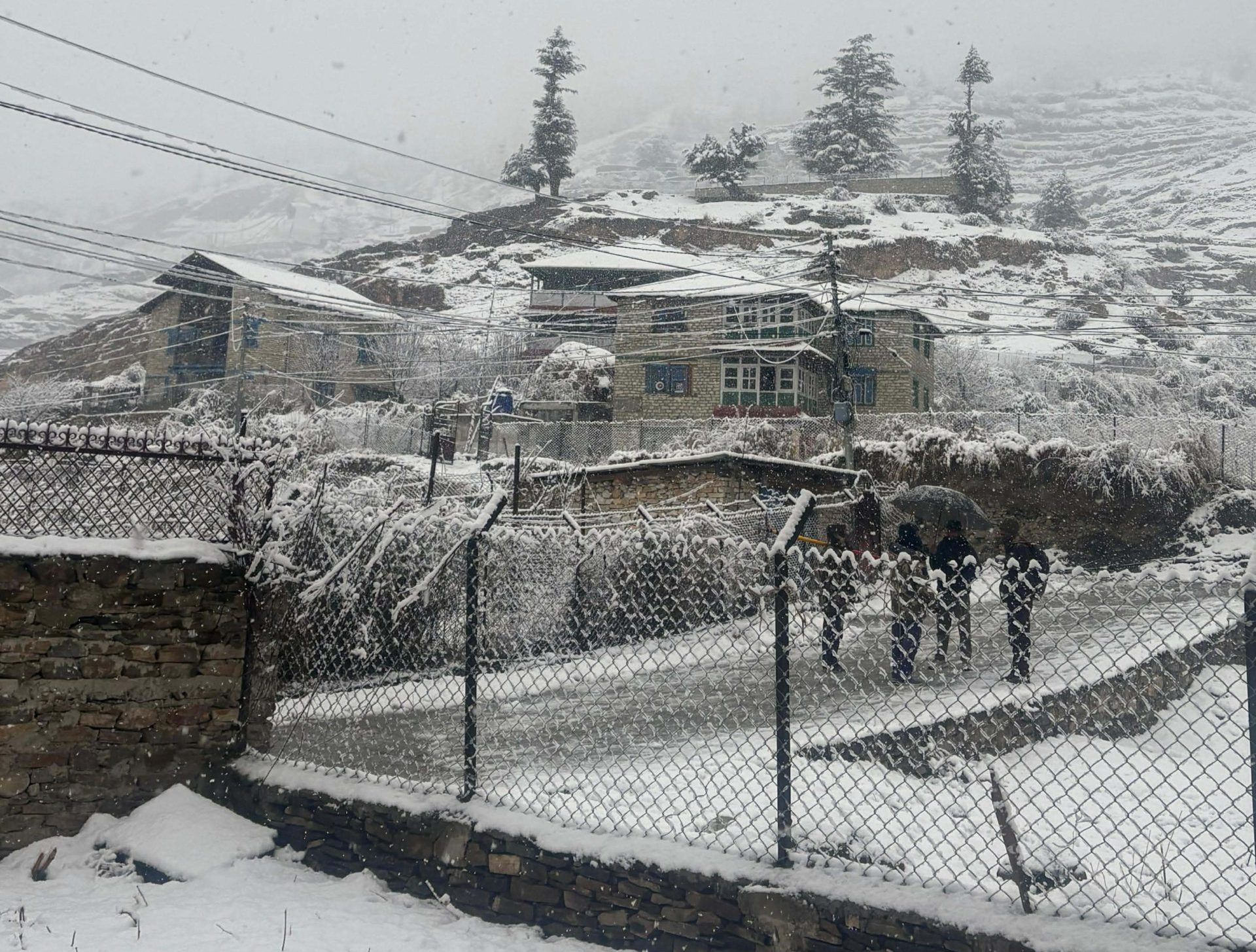 जुम्ला सदरमुकाम खलंगा बजारमा पनि शनिबार बिहान हिमपात भएको छ। हिउ परेपछि खलंगा बजारस्थित कर्णाली स्वास्थ्य विज्ञान प्रतिष्ठानको दृश्य मनमोहक देखिएको छ । प्रतिष्ठानले अहिले हिउको घुम्टो ओडेर बसे जस्तो देखिएको छ ।