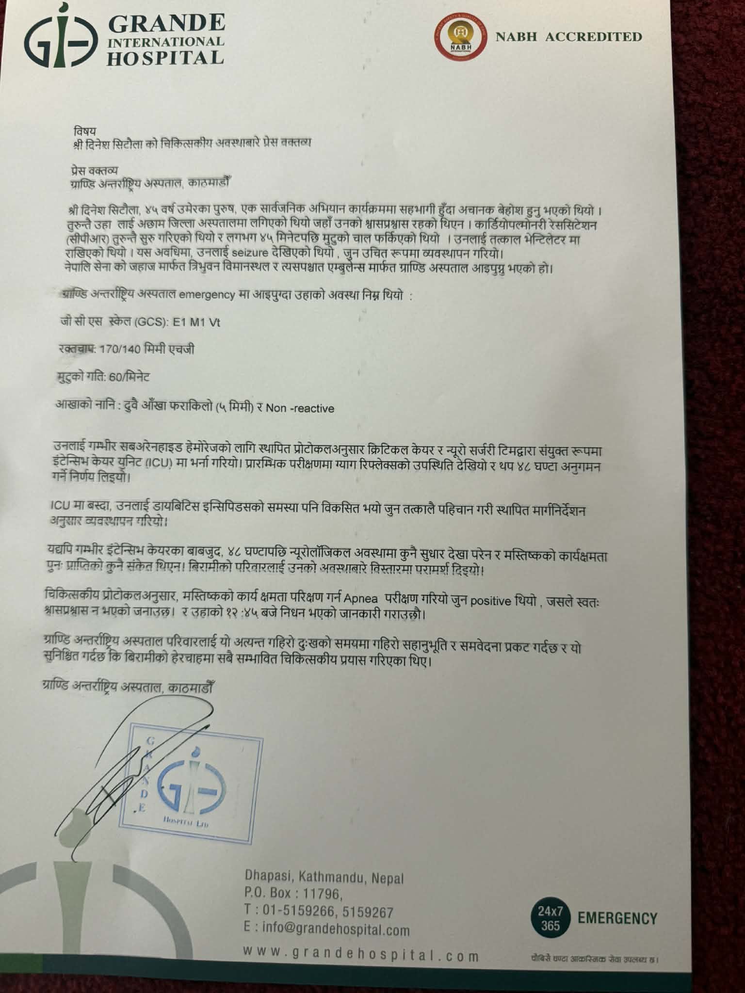 अस्पतालले उनलाई गम्भीर सब अरेनहाइड हमोरेजको लागि स्थापित प्रोटोकल अनुसार क्रिटिकल केयर र न्युरो सर्जरी टिमद्धारा संयुक्त रुपमा इटेन्सिभ केयर युनिटमा भर्ना गरिएको बताउँदै अस्पतालमा ल्याउँदाका बखत गरिएको प्रारम्भिक परीक्षण पछि ग्याग रिप्लेक्सको उपस्थिति देखिएका कारण थप ४८ घण्टा निगरानीमा राखेको उल्लेख गरेको छ ।