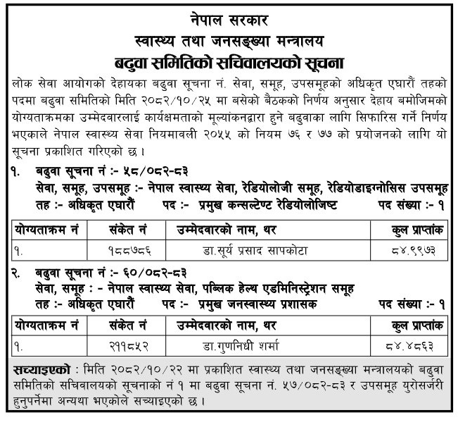 यस्तै नेपाल स्वास्थ्य सेवा, रेडियोलोजी समूह, रेडियोडाईग्नोसिस उपसमूह अन्तर्गत प्रमुख कन्सलटेन्ट एघारौँ तहमा डा सूर्यप्रसाद सापकोटालाई बढुवाको लागि सिफारिस गर्ने निर्णय गरेको छ ।
