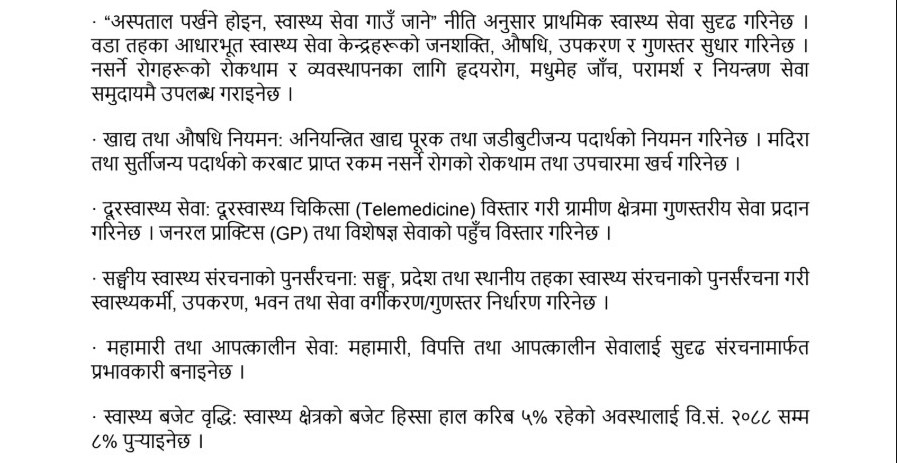 यद्धपी स्वास्थ्यमा त्यति नयाँ र आकर्षक नारा भने राखिएको छैन । स्वास्थ्यमा बजेट ८ प्रतिशत पुरयाउन २०८८ साल पर्खन भनिएको छ ।