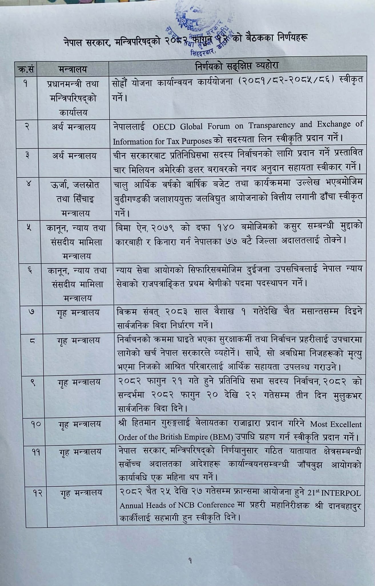 यस्ता छन् मंगलबारको मन्त्रिपरिषद्को बैठकले गरेको २५ निर्णय:
