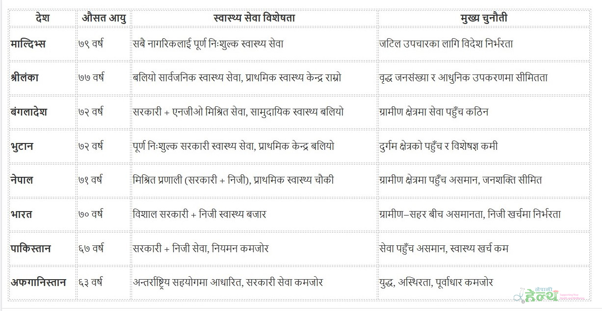 नेपालमा औसत आयु ७१ वर्ष पुगेको छ, जसले सार्क क्षेत्रभित्र नेपाललाई पाँचौँ स्थानमा राखेको छ। नेपालमा सरकारी र निजी दुवै क्षेत्रको मिश्रित स्वास्थ्य प्रणाली सञ्चालनमा छ। प्राथमिक स्वास्थ्य चौकी तथा आधारभूत स्वास्थ्य सेवाको विस्तार भए पनि ग्रामीण क्षेत्रमा सेवा पहुँच असमान हुनु र स्वास्थ्य जनशक्तिको अभाव प्रमुख समस्या मानिएको छ ।