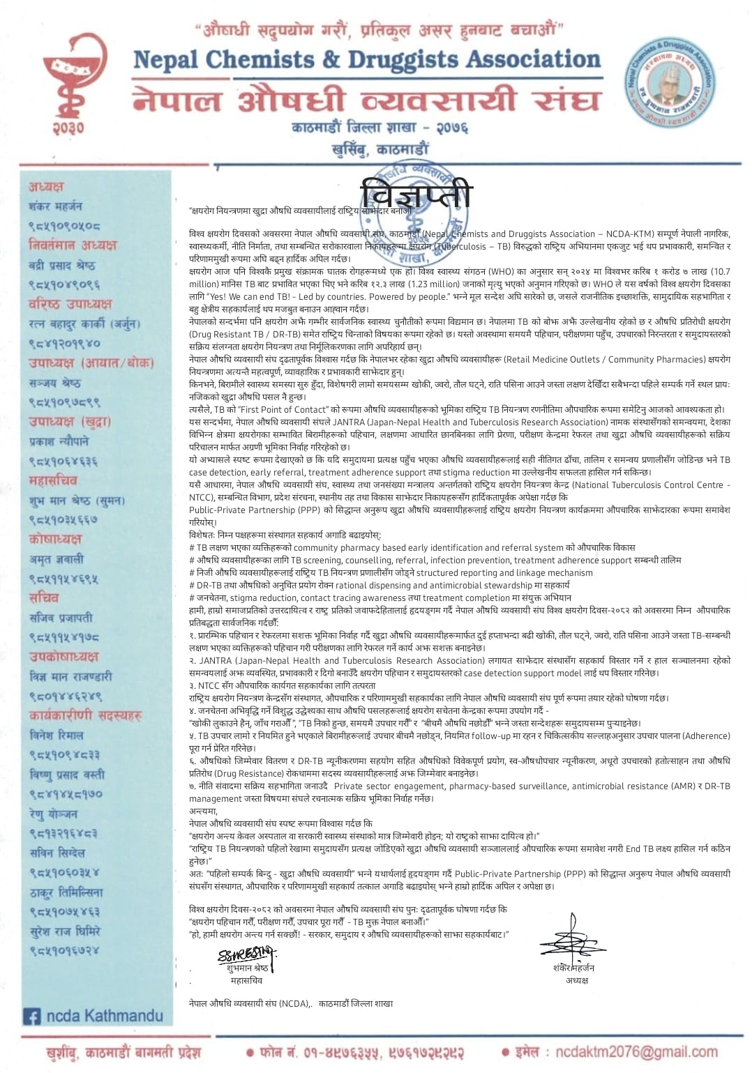 यस वर्षको विश्व क्षयरोग दिवसको सन्देश “हो हामी क्षयरोग अन्त्य गर्छौ : राष्ट्रिय अभियान, हाम्रो योगदान” भनी डब्लुएचओले अघि सारेको सन्दर्भमा संघले राजनीतिक इच्छाशक्ति, सामुदायिक सहभागिता र बहु-क्षेत्रीय सहकार्य अपरिहार्य रहेको जनाएको छ।