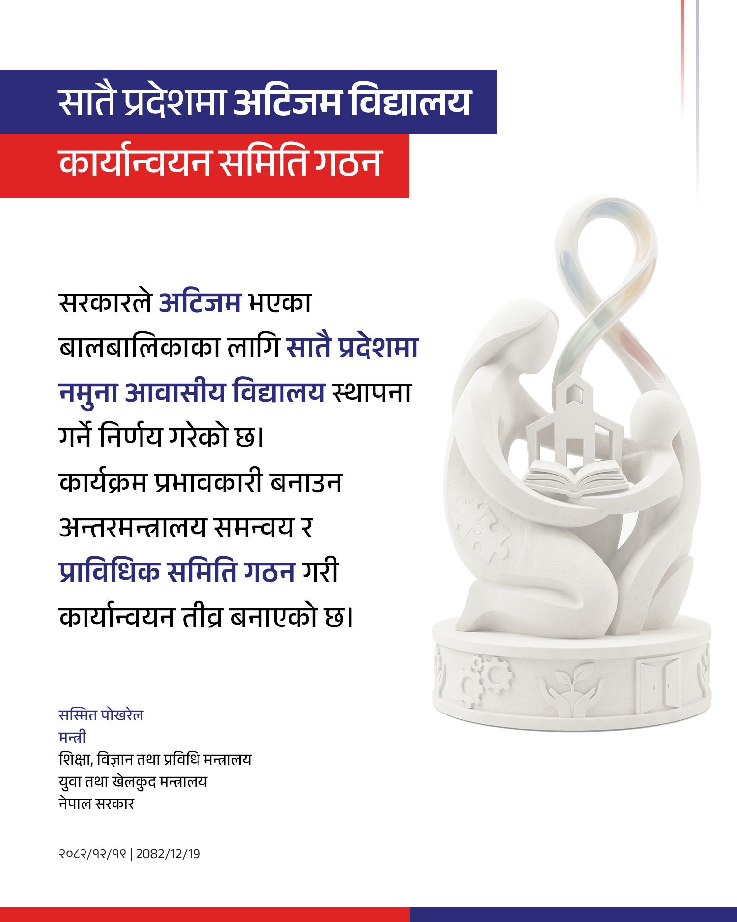 काठमाडौँ, २० चैत । सरकारले सातवटै प्रदेशमा एक एक वटा अटिजममा आधारित नमूना विद्यालय स्थापना गर्ने भएको छ । विश्व अटिजम सचेतना दिवसको अवसर पारेर शिक्षा विज्ञान तथा प्रविधि मन्त्रालयले यस्तो घोषणा गरेको हो ।