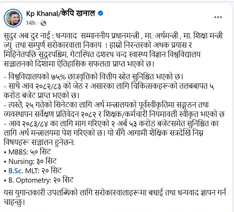 त्यसो त सांसद खनालले विश्वविद्यालयको ७५ प्रतिशत छात्रबृत्तिको लागि वित्तीय स्रोत सुनिश्चित भएको, आगामी जेठ असारका लागि चिकित्सकको तलव वापत ५ करोड बजेट प्राप्त भएको समेत उल्लेख गरेका छन् । २५ चैतमा बस्ने सिनेटका लागि अर्थ मन्त्रालयको पूर्व स्वीकृतिमा संगठन तथा व्यवस्थापन सर्वेक्षण प्रतिवेदन २०८२ र शिक्षक कर्मचारी नियमावली समेत स्विकृत भएको उल्लेख गरेका छन् ।