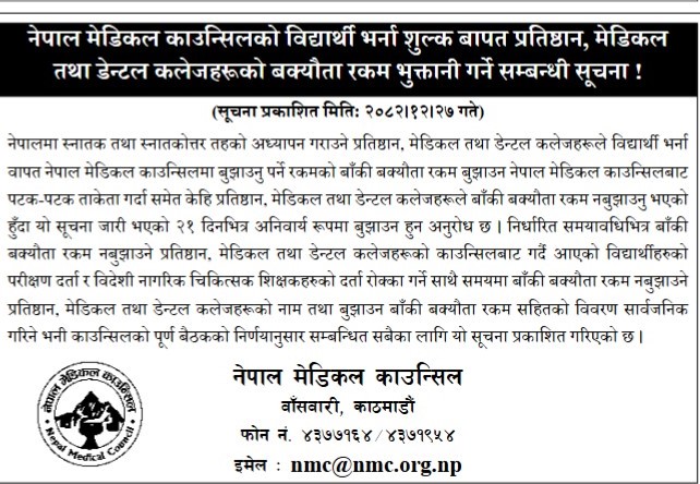 स्नातक तथा स्नातकोत्तर तहको अध्ययन् गराउने ती शैक्षिक संस्थालाई यसअघि पटक पटक ताकेता गर्दा पनि रकम नबुझाएको भन्दै काउन्सिलले आज सार्वजनिक सूचना जारी गरेको हो ।
