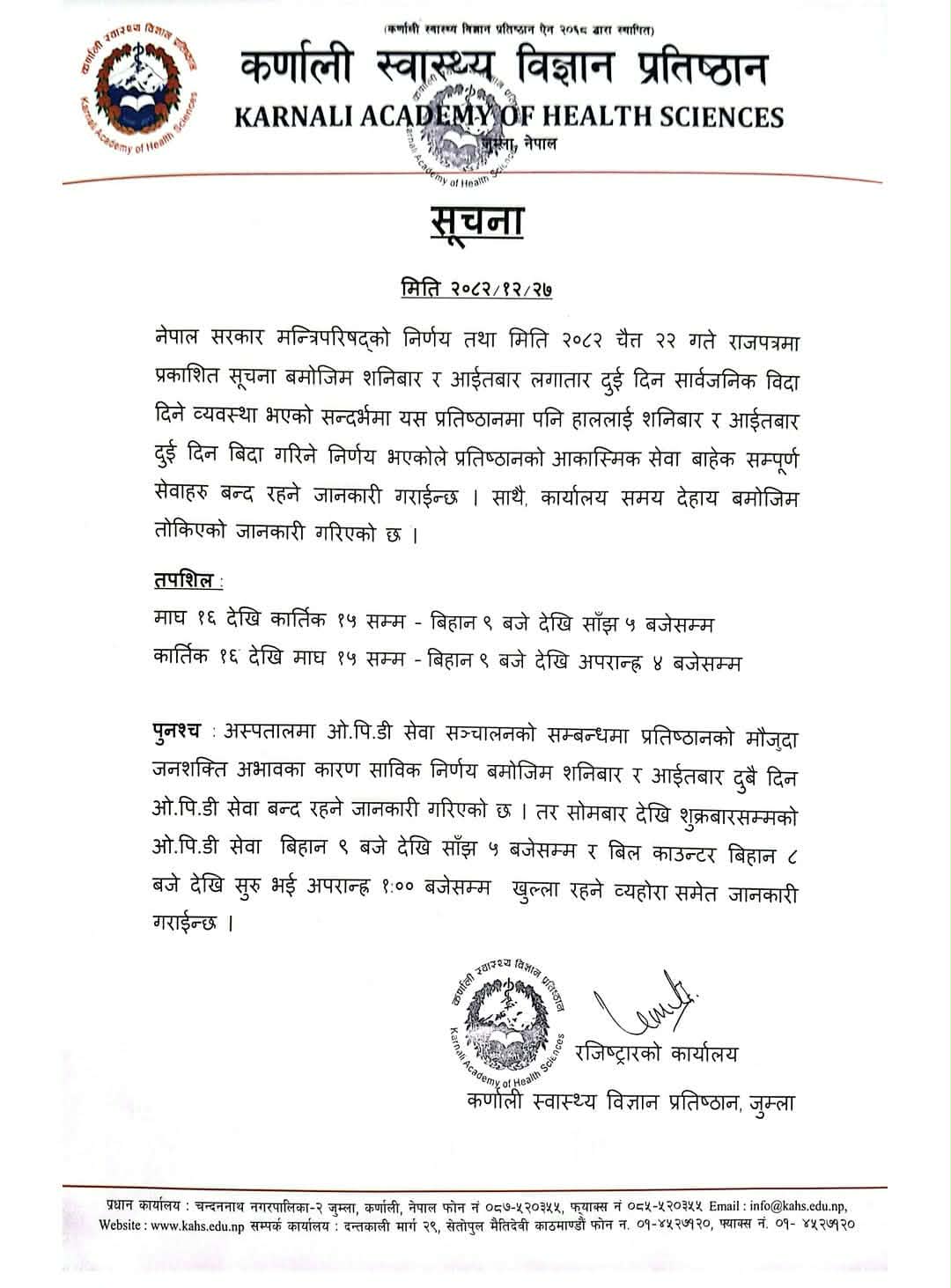 कर्णाली स्वास्थ्य विज्ञान प्रतिष्ठानले शनिबार जस्तै आइतबार पनि ओपिडी लगायतका सेवा बन्द हुने सूचना जारी गरेको छ ।