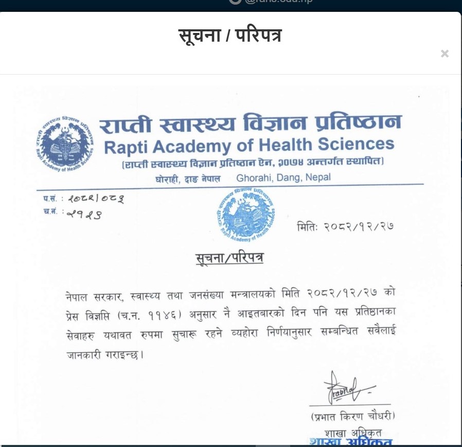 उसले आकस्मिक सेवा भने निरन्तरता हुने बताएको छ । यता राप्ती स्वास्थ्य विज्ञान प्रतिष्ठानले भने स्वास्थ्य मन्त्रालयको परिपत्र अनुसार आइतबारको ओपिडी सेवा निरन्तर चल्ने बताएको छ ।