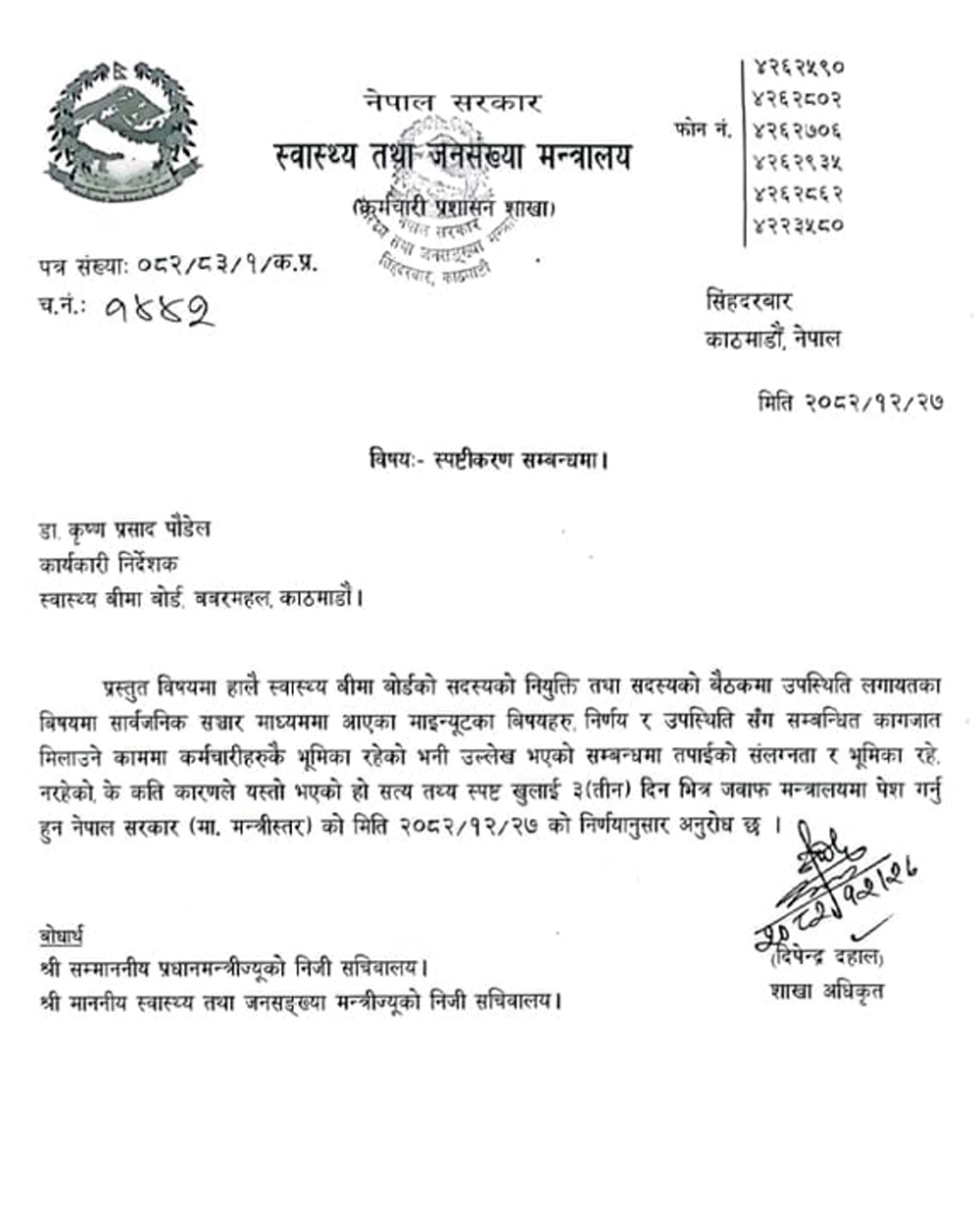 पत्रमा स्वास्थ्य बीमा बोर्डका सदस्य नियुक्ति, बैठकमा उपस्थितिसम्बन्धी अभिलेख तथा निर्णय प्रक्रियासँग जोडिएका विषयमा सञ्चारमाध्यममा आएका विवरणप्रति मन्त्रालयको गम्भीर ध्यानाकर्षण भएको उल्लेख छ । ती विषयमा वास्तविकता स्पष्ट पार्न दुवै अधिकारीसँग स्पष्टीकरण मागिएको मन्त्रालयले पठाएको पत्रमा उल्लेख छ।
