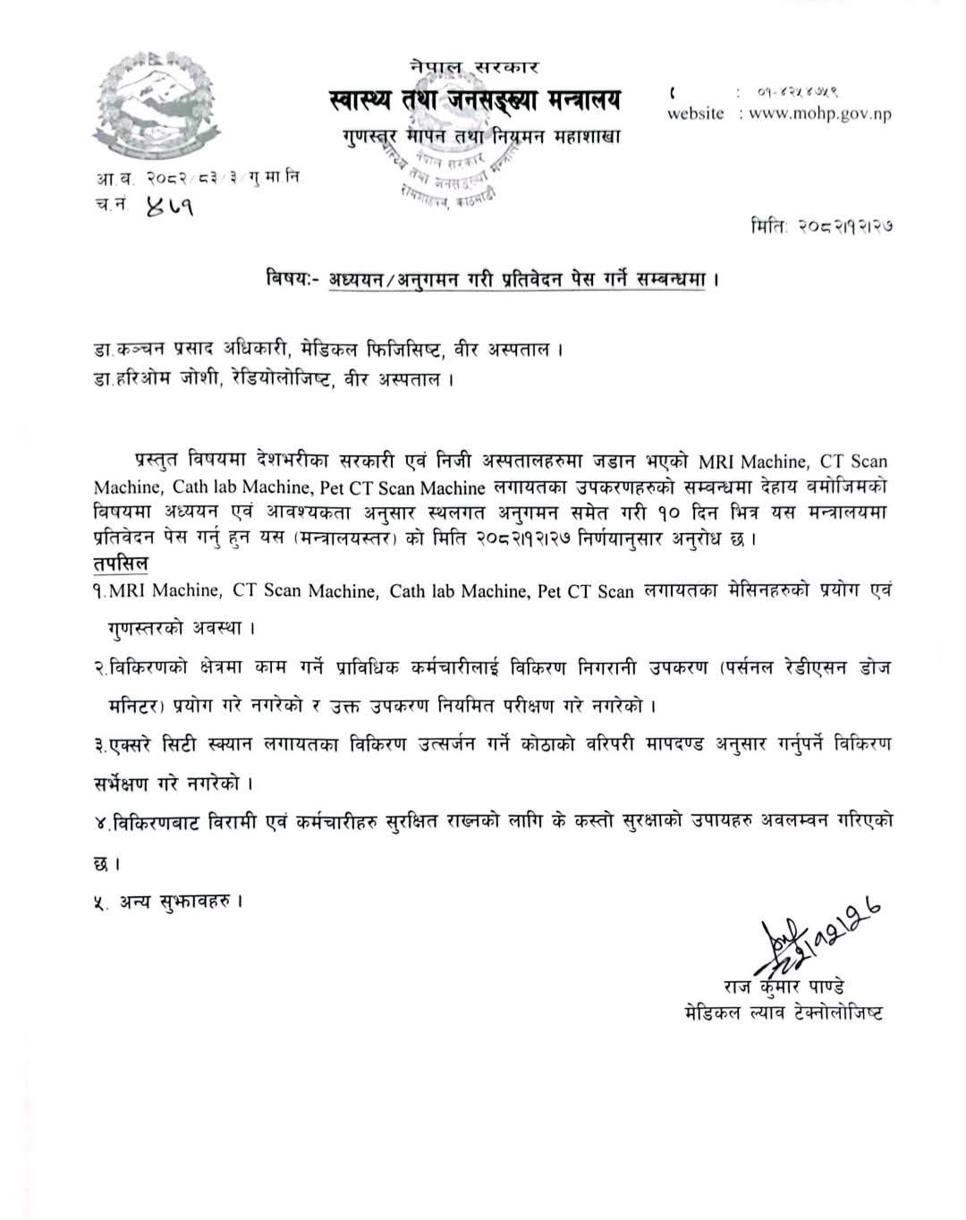 चिकित्सकद्धयलाई सरकारी तथा निजी अस्पतालमा जडान भएका एमआरआई, सीटी स्क्यान, क्याथ ल्याब तथा पेट सीटी स्क्यान जस्ता उपकरणहरूको प्रयोग, मापदण्ड र सुरक्षा व्यवस्थाबारे अध्ययन गरी १० दिनभित्र प्रतिवेदन पेस गर्न भनिएको छ।