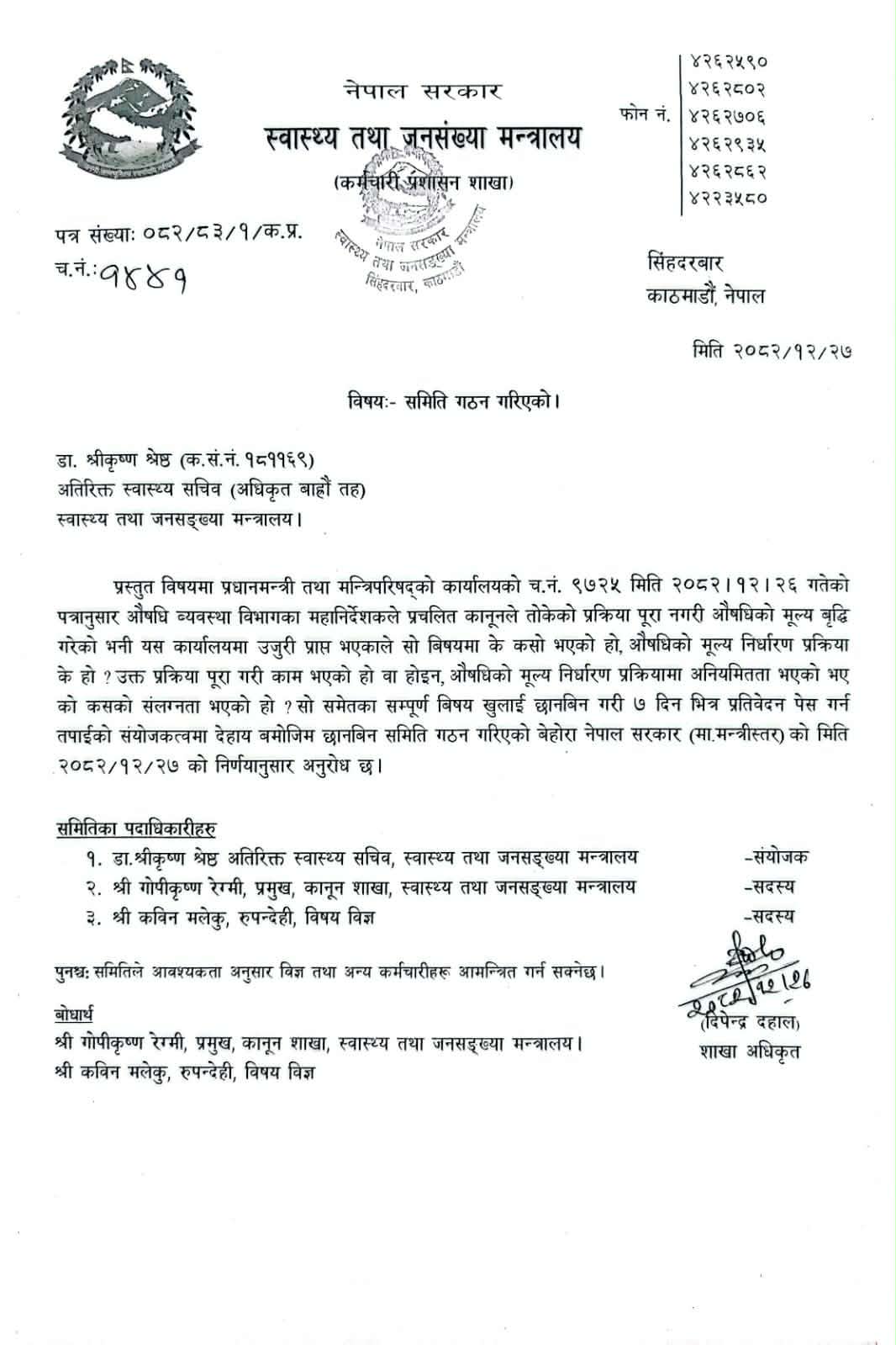काठमाडौँ, ३० चैत । स्वास्थ्य तथा जनसंख्या मन्त्री निशा मेहताले गत २७ चैतमा औषधी व्यवस्था विभागका तत्कालीन महानिर्देशक नारायणप्रसाद ढकालले ‘प्रचलित कानूनले तोकेको प्रक्रिया पुरा नगरी औषधीको मूल्य बढाएको हो होईन ?’ भनेर छानविन गर्न अतिरिक्त स्वास्थ्य सचिव डा. श्रीकृष्ण श्रेष्ठको संयोजकत्वमा तीन सदस्यीय समिति गठन गरिन् ।
