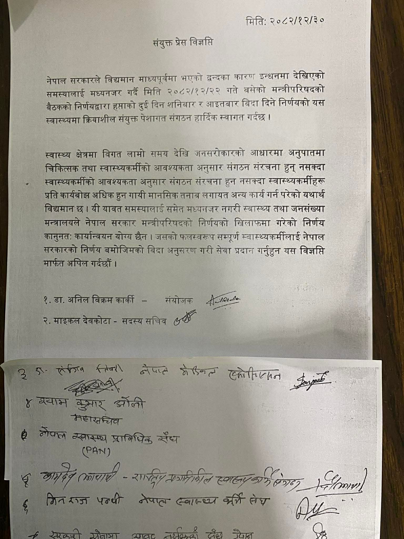 अहिले मन्त्रालयले दुई दिने विदाको विरुद्धमा जो निर्णय गरेको छ त्यसको खिलापमा स्वास्थ्यकर्मीहरु जान अपिल गर्दछ । विज्ञप्तीमा भनिएको छ ।