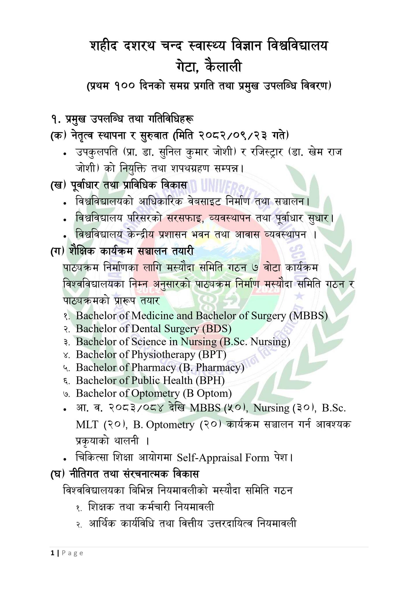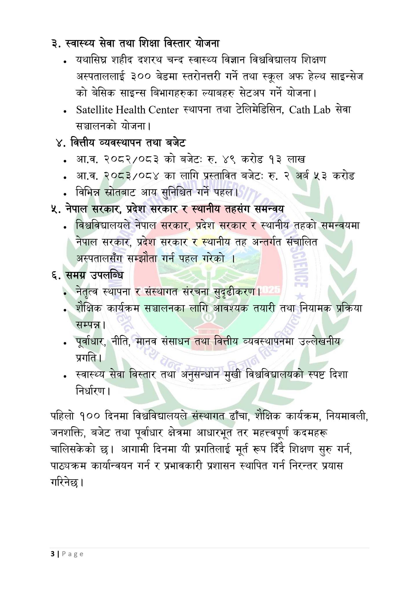 शहीद दशरथ चन्द स्वास्थ्य विज्ञान विश्वविद्यालयका १०० दिन: पूर्वाधार, कार्यक्रम र सेवा विस्तारमा तीव्र प्रगति