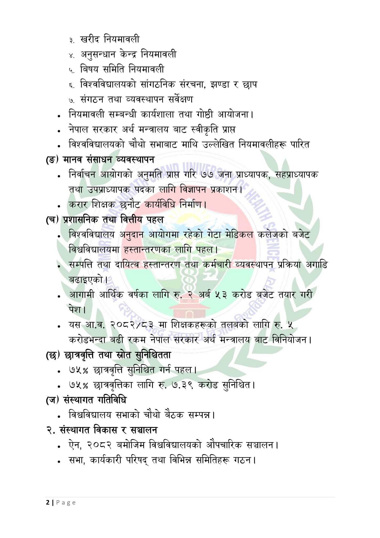 नीतिगत तथा संस्थागत विकासअन्तर्गत शिक्षक तथा कर्मचारी नियमावली, आर्थिक कार्यविधि तथा वित्तीय उत्तरदायित्व सम्बन्धी नियमावली लगायत विभिन्न मस्यौदा तयार पारिएको छ। खरीद, अनुसन्धान केन्द्र, विषय समिति तथा संगठन संरचनासम्बन्धी नियमावली निर्माण प्रक्रियामा रहेका छन्।
