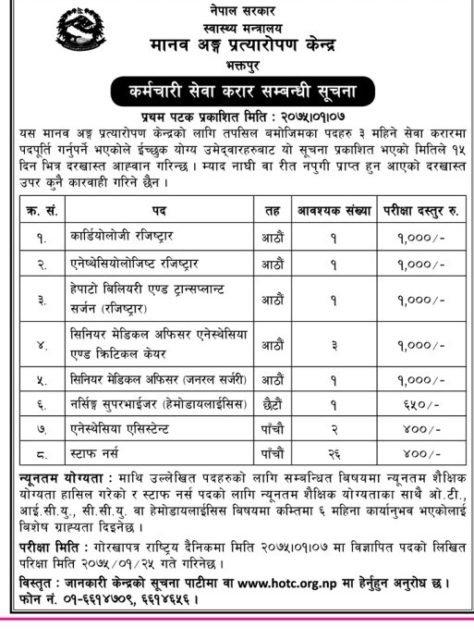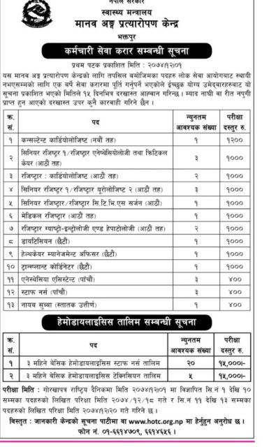 काठमाडौँ, ११ कात्तिक । शहीद धर्मभक्त राष्ट्रिय प्रत्यारोपण केन्द्र (मानवअंग प्रत्यारोपण केन्द्र)मा विशेषज्ञ चिकित्सक देखि स्टाफ नर्ससम्मका लागि रोजगारीको अवसर खुलेको छ ।
